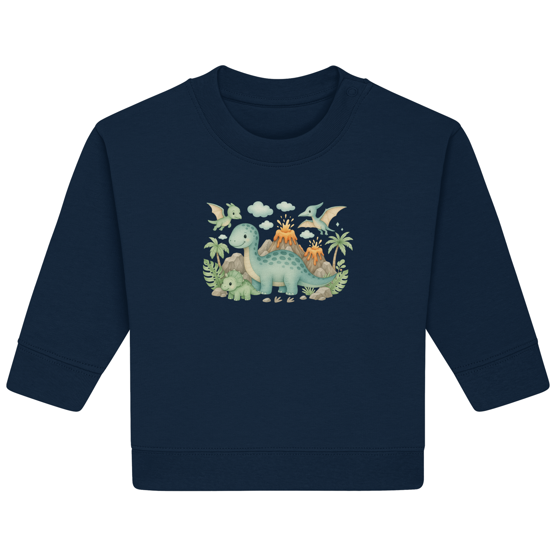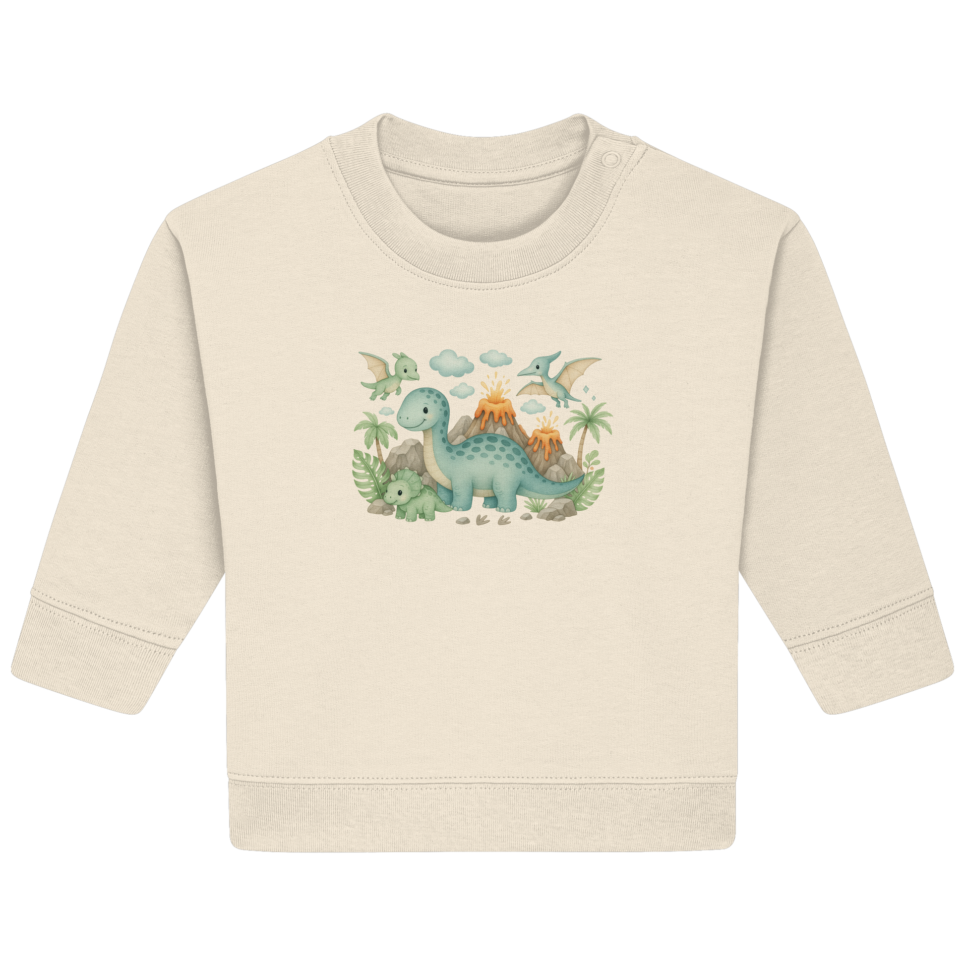 Entdecken Sie das Abenteuer mit unserem Dinosaurier Baby Organic Sweatshirt, das speziell für kleine Entdecker entworfen wurde. Die liebevoll gestalteten Dinosauriermotive, eingebettet in eine traumhafte Vulkanlandschaft, wecken die Fantasie und zaubern ein Lächeln auf jedes Kindergesicht.